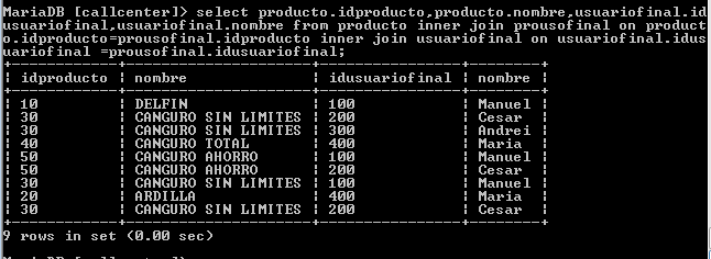 select producto.idproducto,producto.nombre,usuariofinal.idusuariofinal,usuariofinal.nombre from producto inner join prousofinal on producto.idproducto=prousofinal.idproducto inner join usuariofinal on usuariofinal.idusuariofinal =prousofinal.idusuariofinal;
